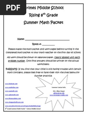 8th Grade Summer Math Packet Answer Key 2018